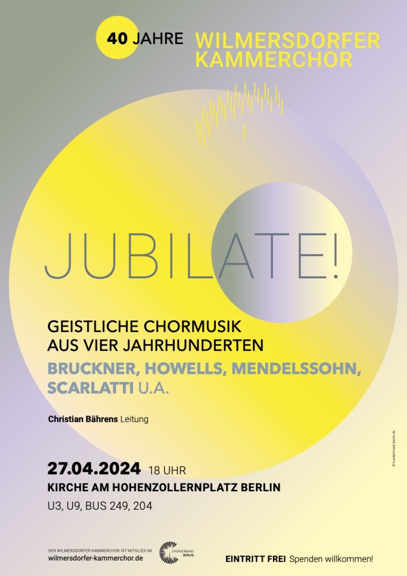 Der Wilmersdorfer Kammerchor feierte in diesem Jahr sein 40jähriges Bestehen mit mehreren Konzertprojekten. Das erste Konzert unter dem Thema JUBILATE! Geistliche Musik aus vier Jahrhunderten fand am Samstag, 27. April um 18 Uhr in der Kirche am Hohenzollernplatz statt. In Kürze ging das Ensemble mit diesem Programm auf Konzertreise.
